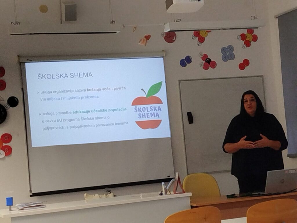 U četvrtak, 16. listopada 2025. godine, u okviru programa Školska shema, profesorica Zdravka Hamadi održala je edukativno predavanje za učenike šestog razreda. Tema predavanja bila je usmjerena na važnost pravilne prehrane, s posebnim naglaskom na ulogu voća i povrća u svakodnevnom jelovniku.