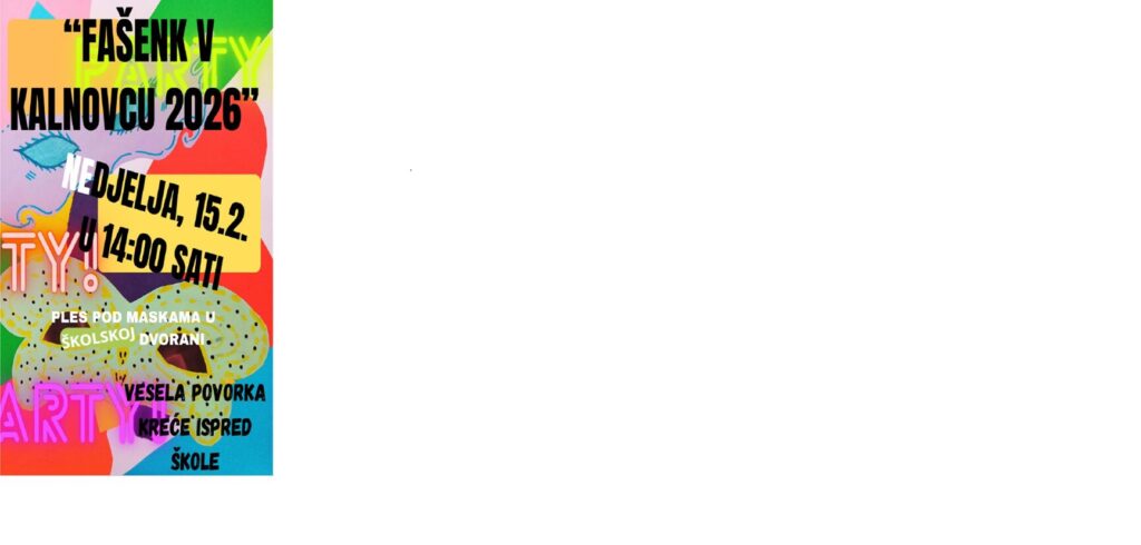 Pozivamo vas da nam se pridružite na Fašenku v Kalnovcu 2026., najveselijoj fašenskoj zabavi u našem kraju! Pridružite nam se u nedjelju, 15. veljače 2026., s početkom u 14:00 sati ispred škole.